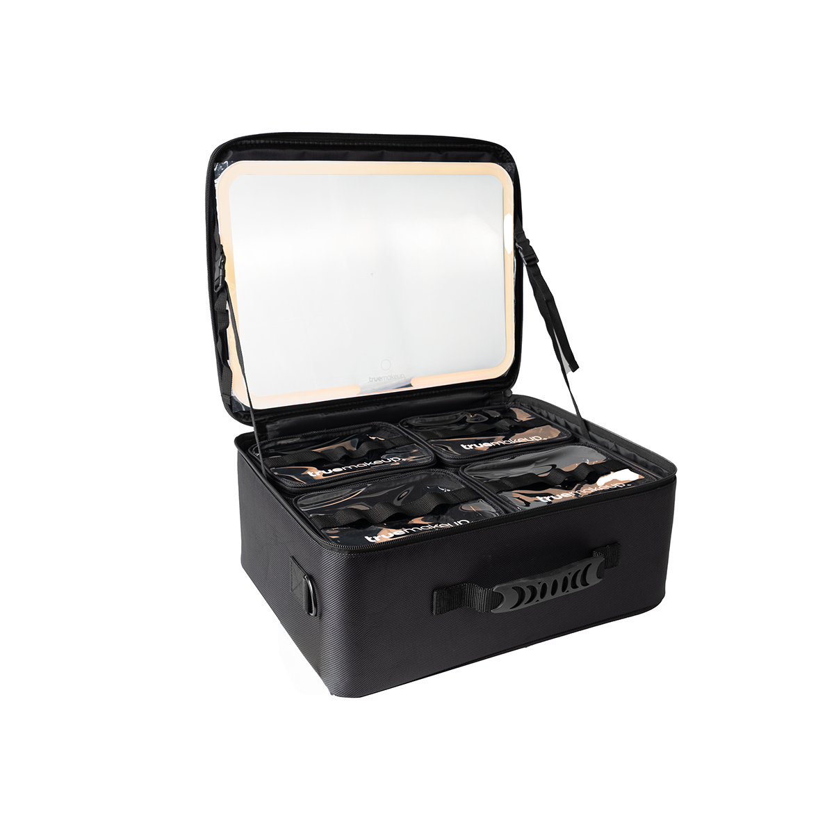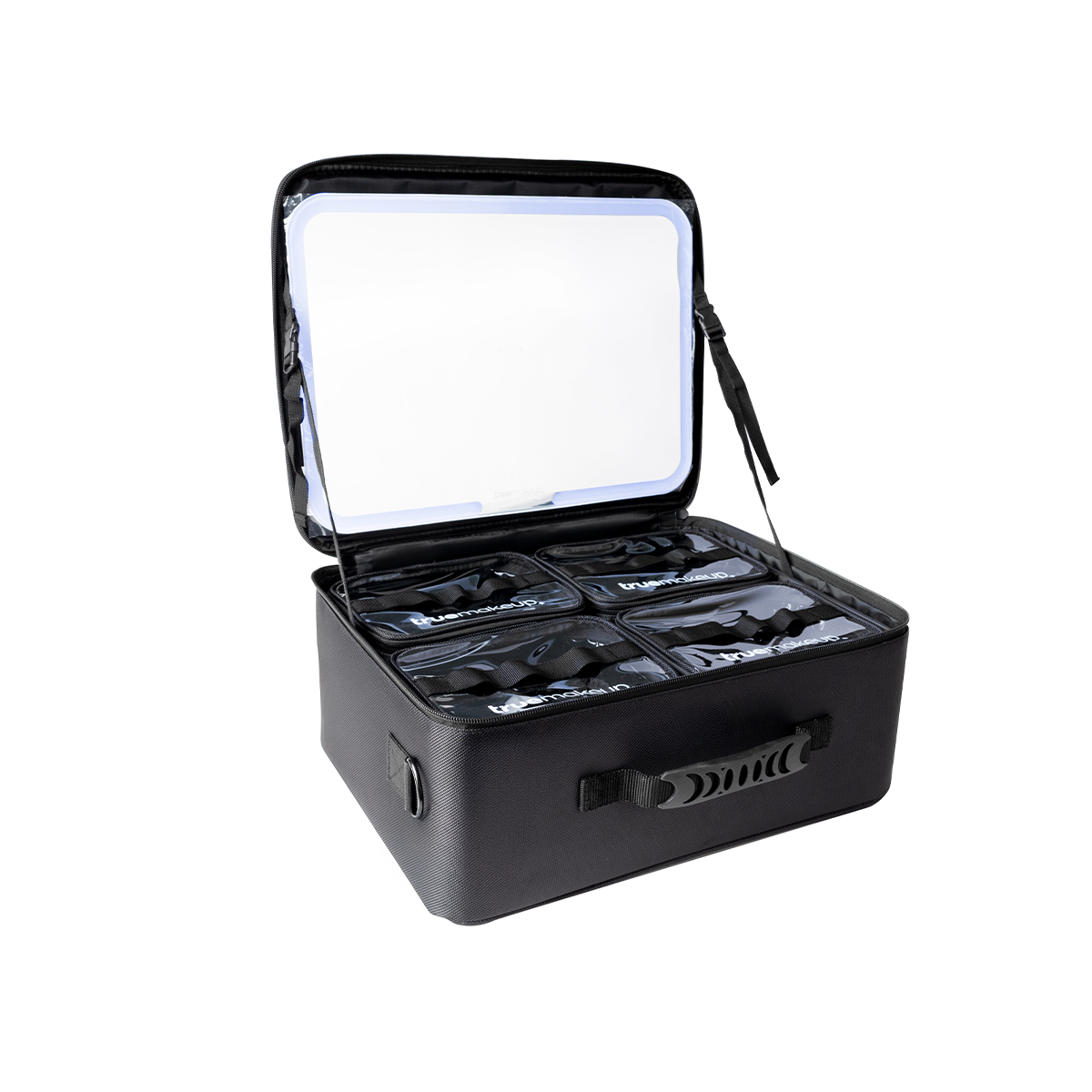 Maletín profesional con espejo LED de tres modos de luz. Incluye 4 cosmetiqueras extraíbles y separadores removibles para una organización práctica. Fabricado en nylon y PVC, resistente y fácil de transportar. Ideal para uso profesional.